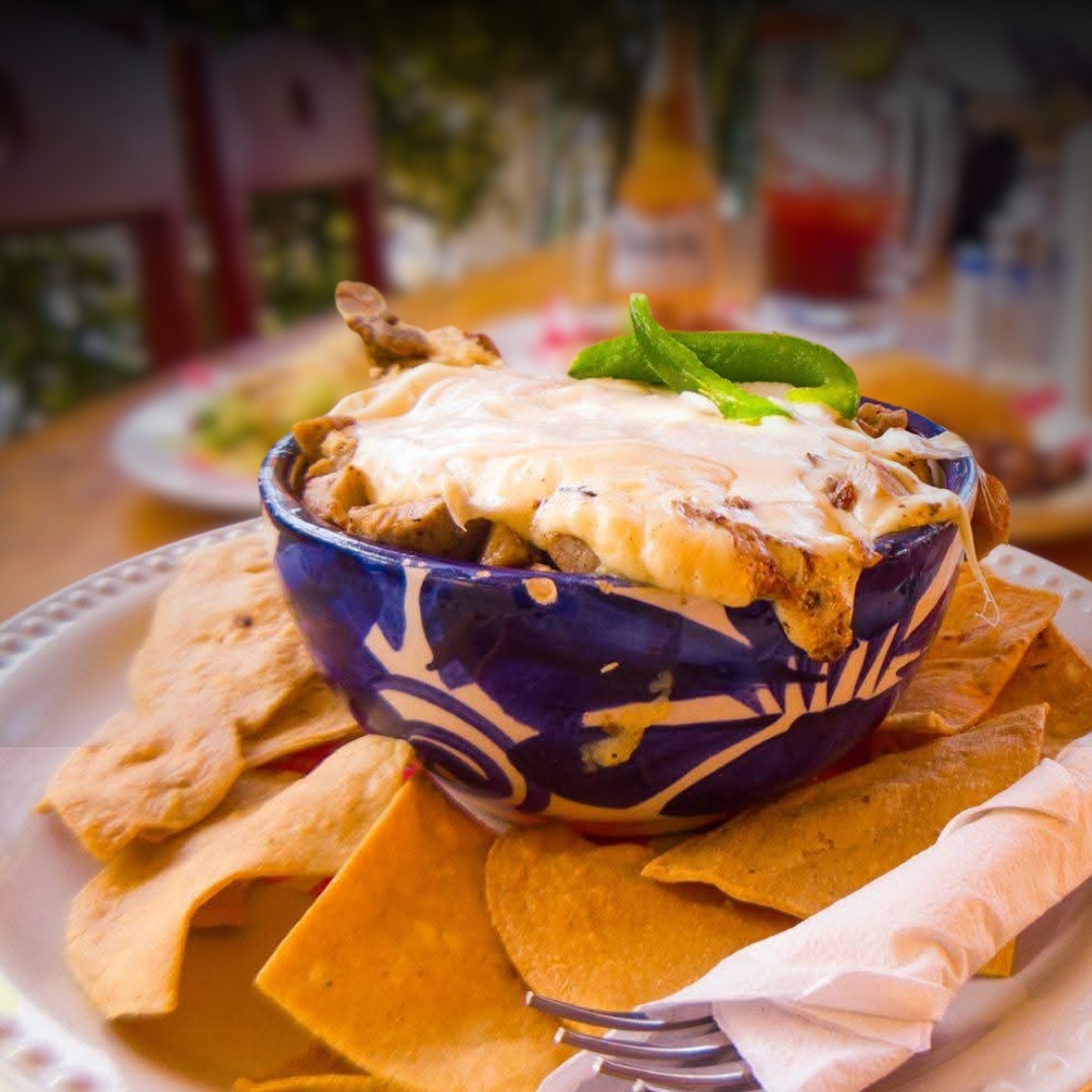 TOTOPOS+FRIJOLES COLADOS+QUESO+CARNE+PICO DE GALLO+ CHILES SERRANOS+ GUACAMOLE