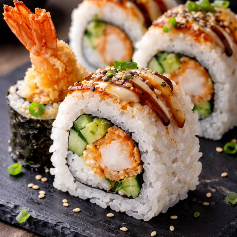 PD. camarón empanizado , aguacate hass, Philadelphia y pepino. PF. Aderezo chipotle y anguila.