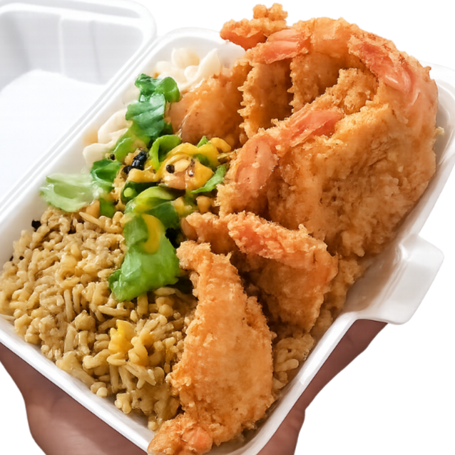 8 camarones al ajo jumbo acompañados de arroz, sopa fría y ensalada