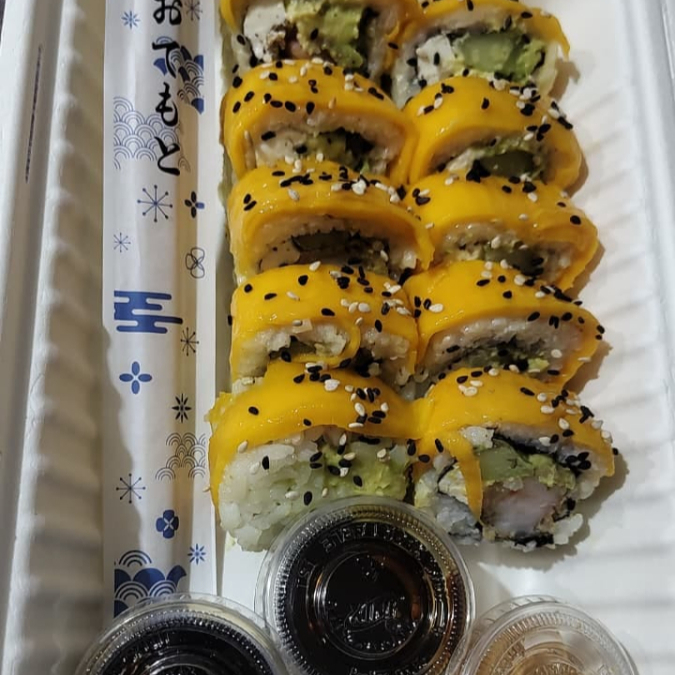 PD: pollo empanizado,queso crema, aguacate,pepino y alga nori PF: mango, mix de ajonjoli
