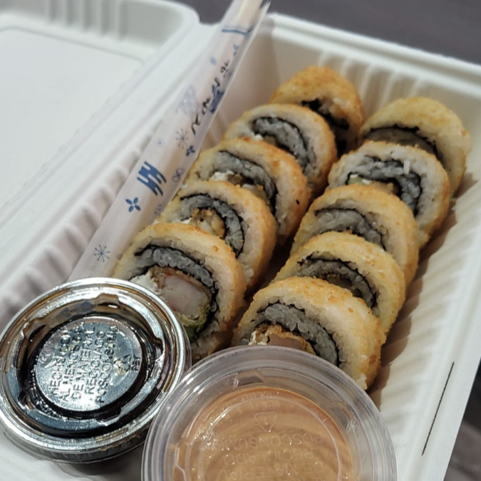 PD: Pollo empanizado, Queso crema, Aguacate, Pepino y Alga nori. PF: Rollo empanizado