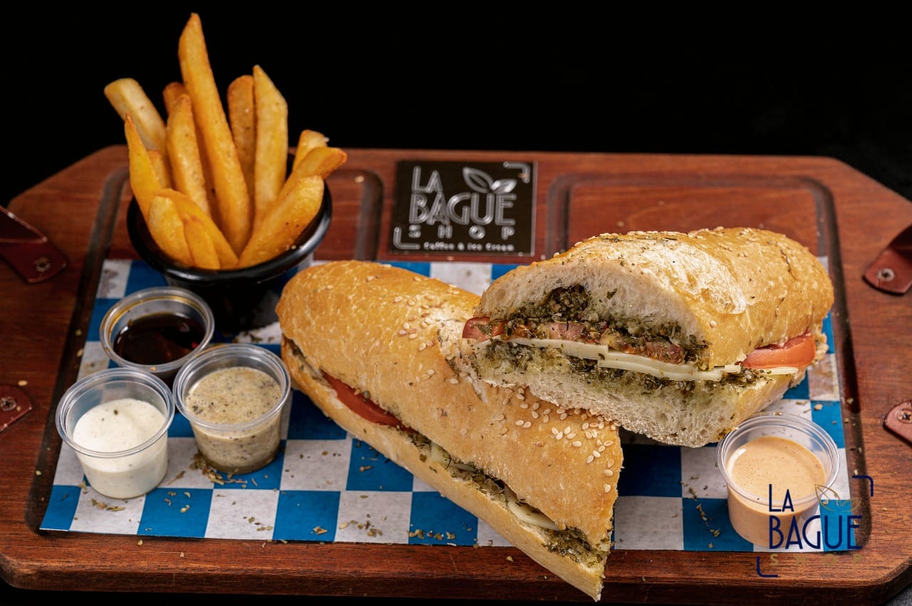 Chorizo español, chuleta ahumada, tocino, queso gouda, tomate deshidratado. guacamole y aderezo bagueshop