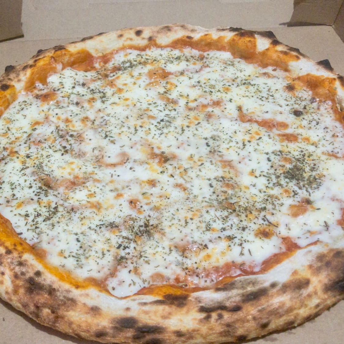 Masa italiana a la leña servida con salsa de tomate pelati, queso mozzarella y albahaca.