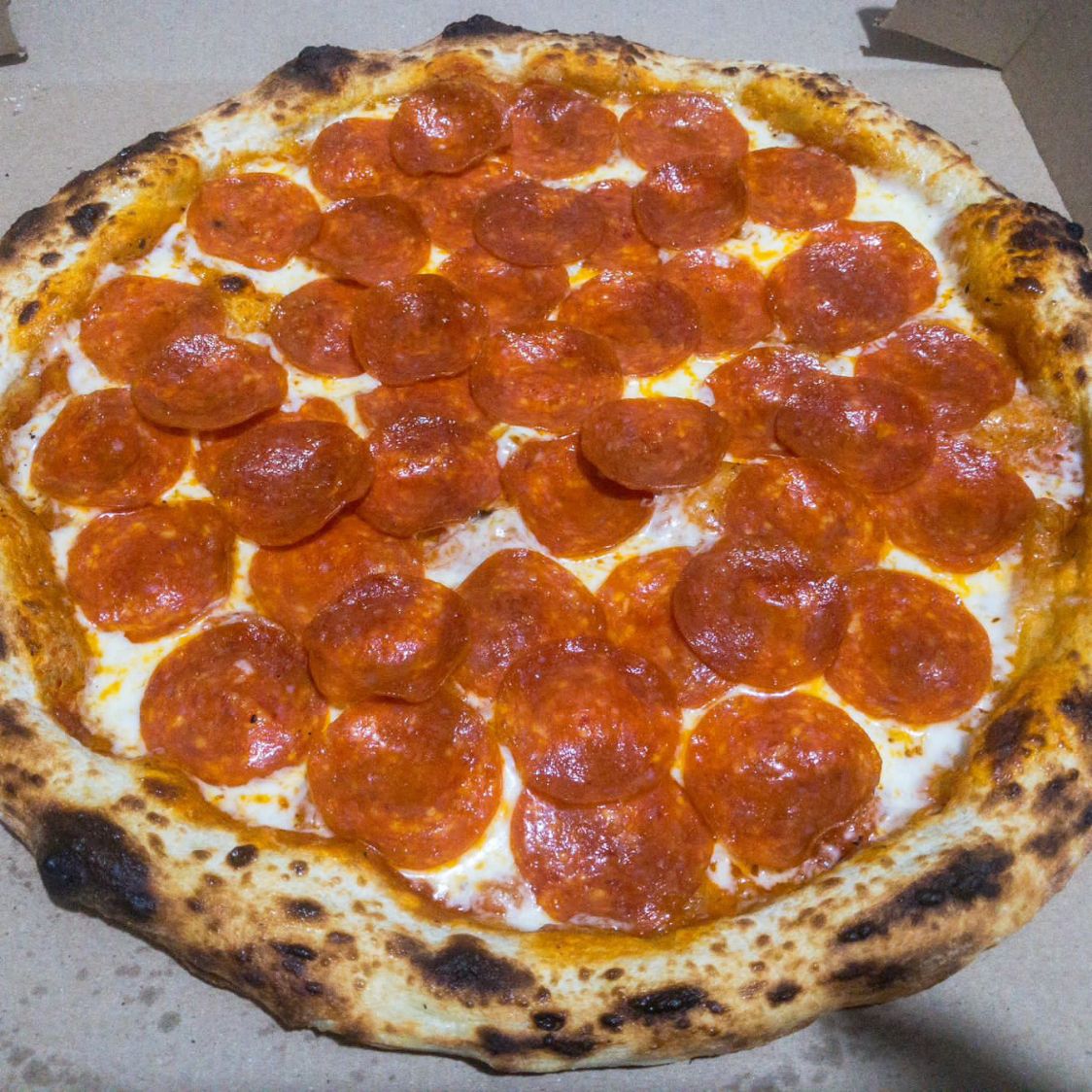 Masa italiana a la leña servida con salsa de tomate pelati, queso mozzarella y pepperoni.