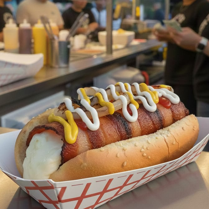 Salchicha Asadera con Queso Manchego, cebolla y aderezos (catsup, mayonesa y mostaza), no incluye tocino.