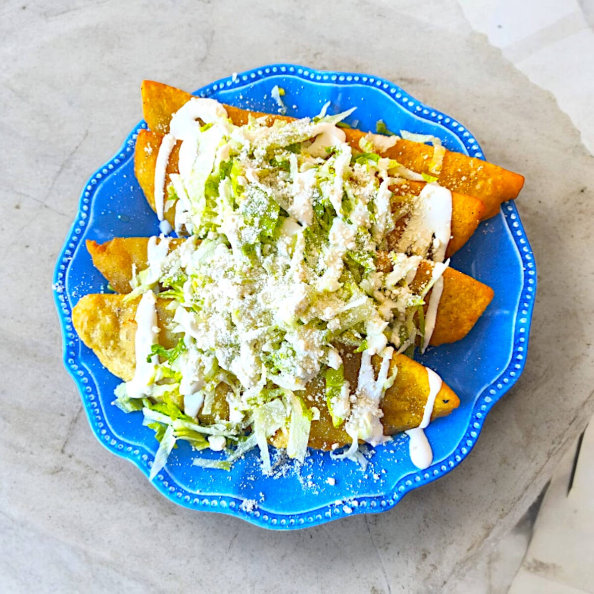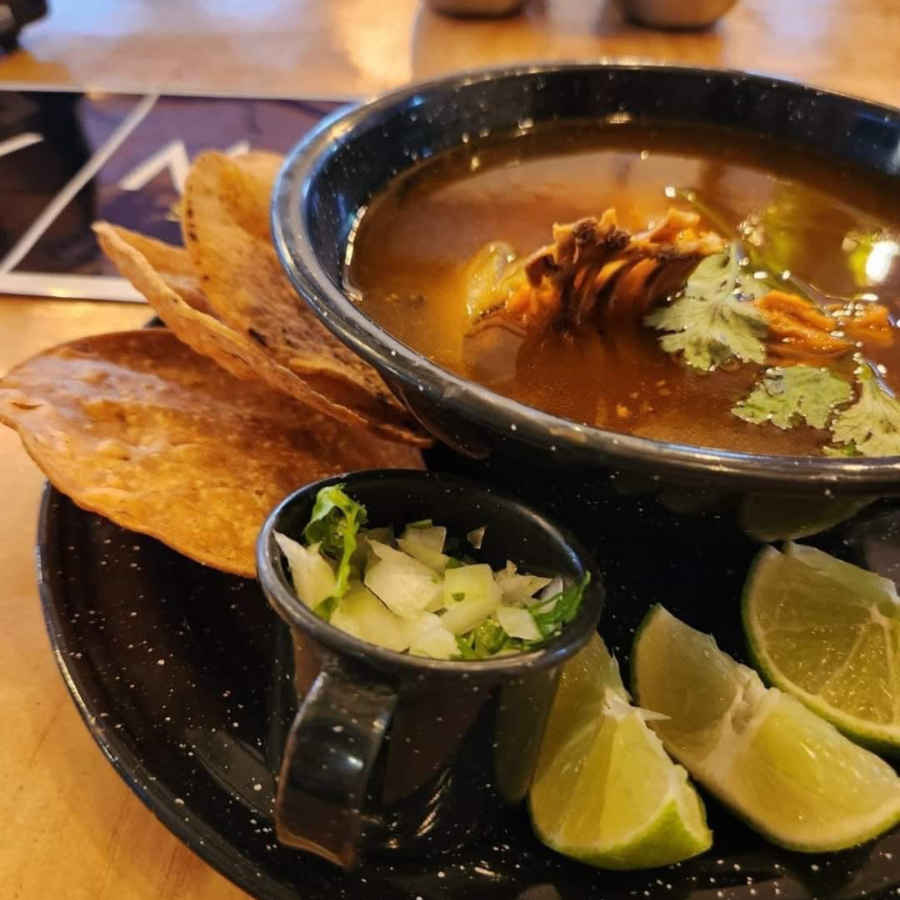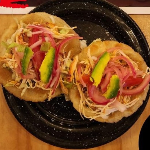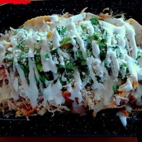 Pollo, frijol, romanita, tomate, cebolla curtida, queso de bola, media crema