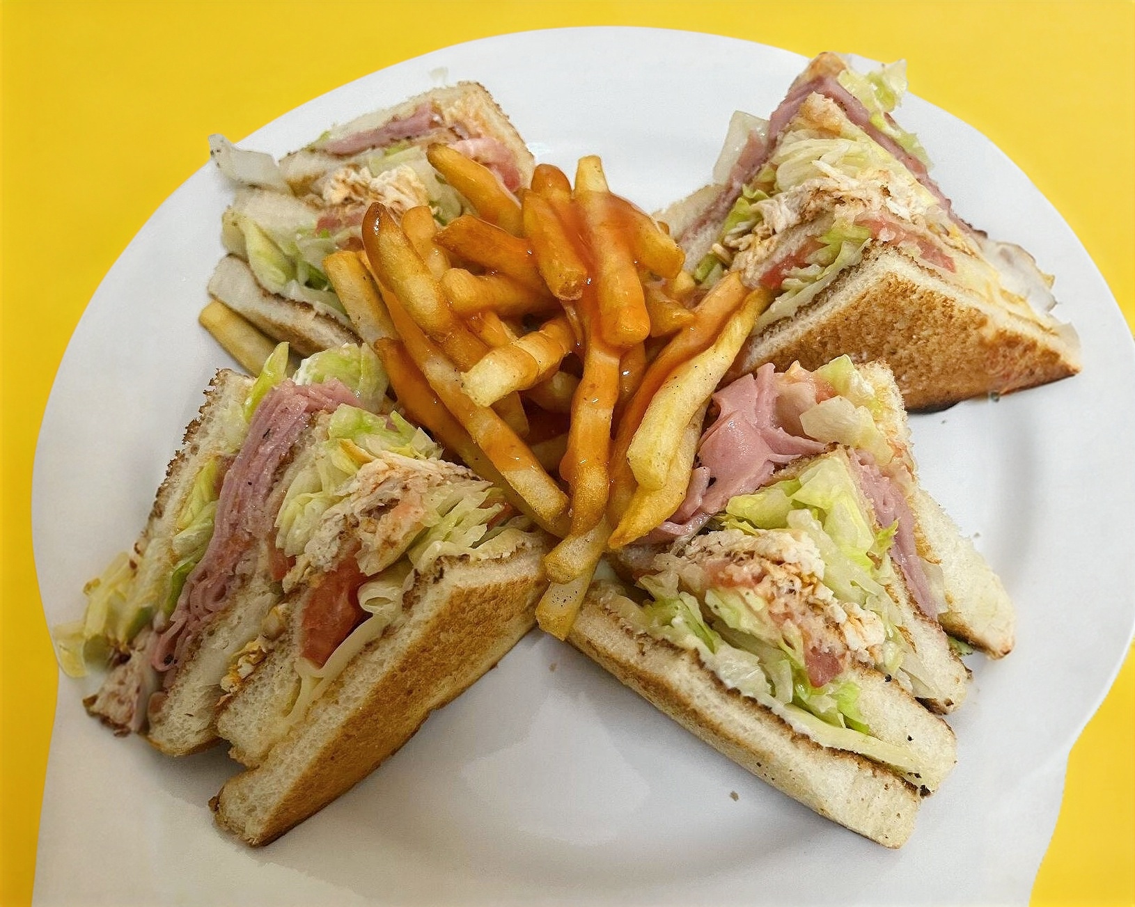 Doble sándwich más pollo jamón queso vegetales y papas a la francesa