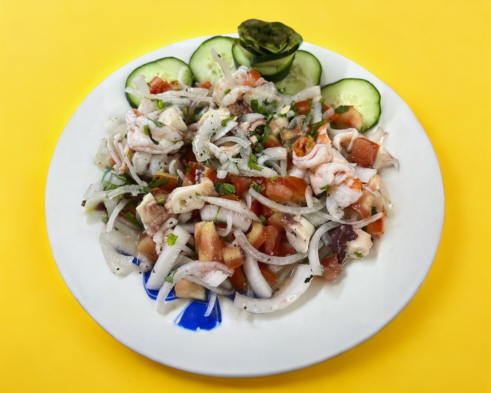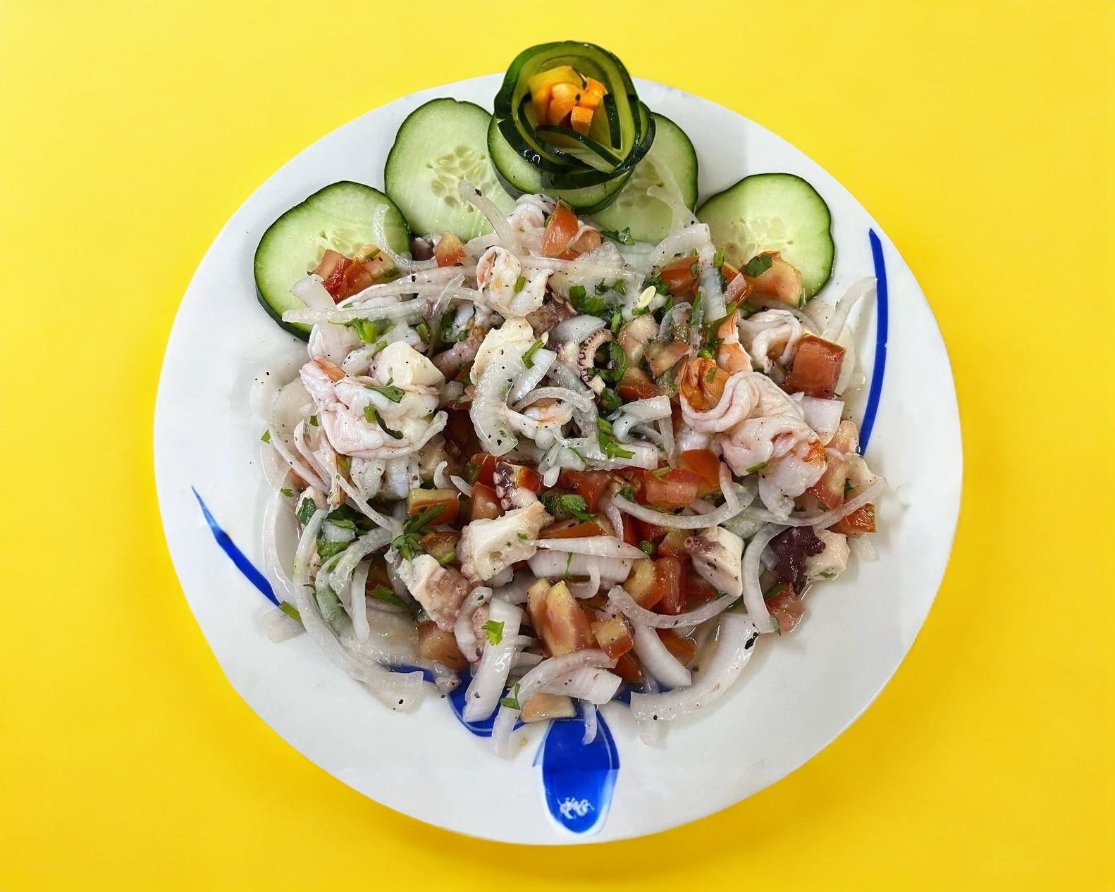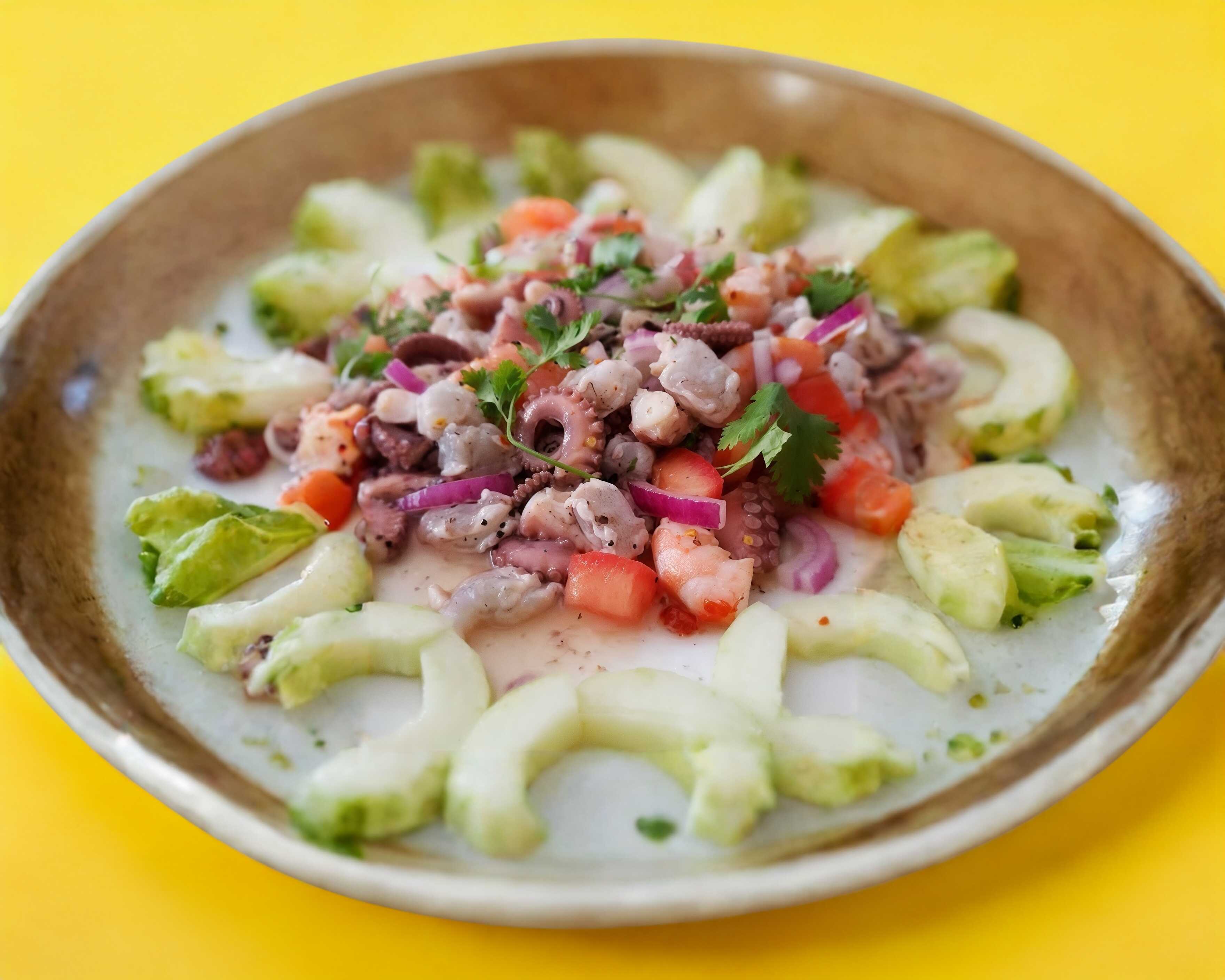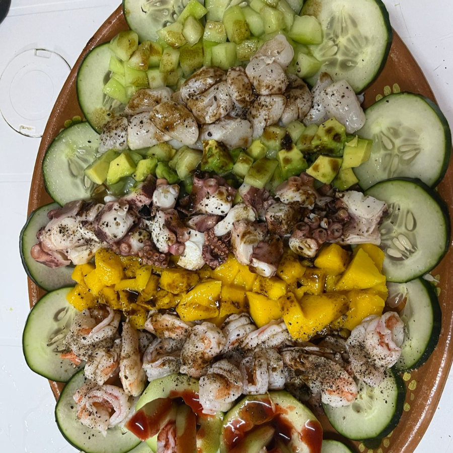 camaron, caracol y pulpo curtido con mango, pepino verde y otras especias
