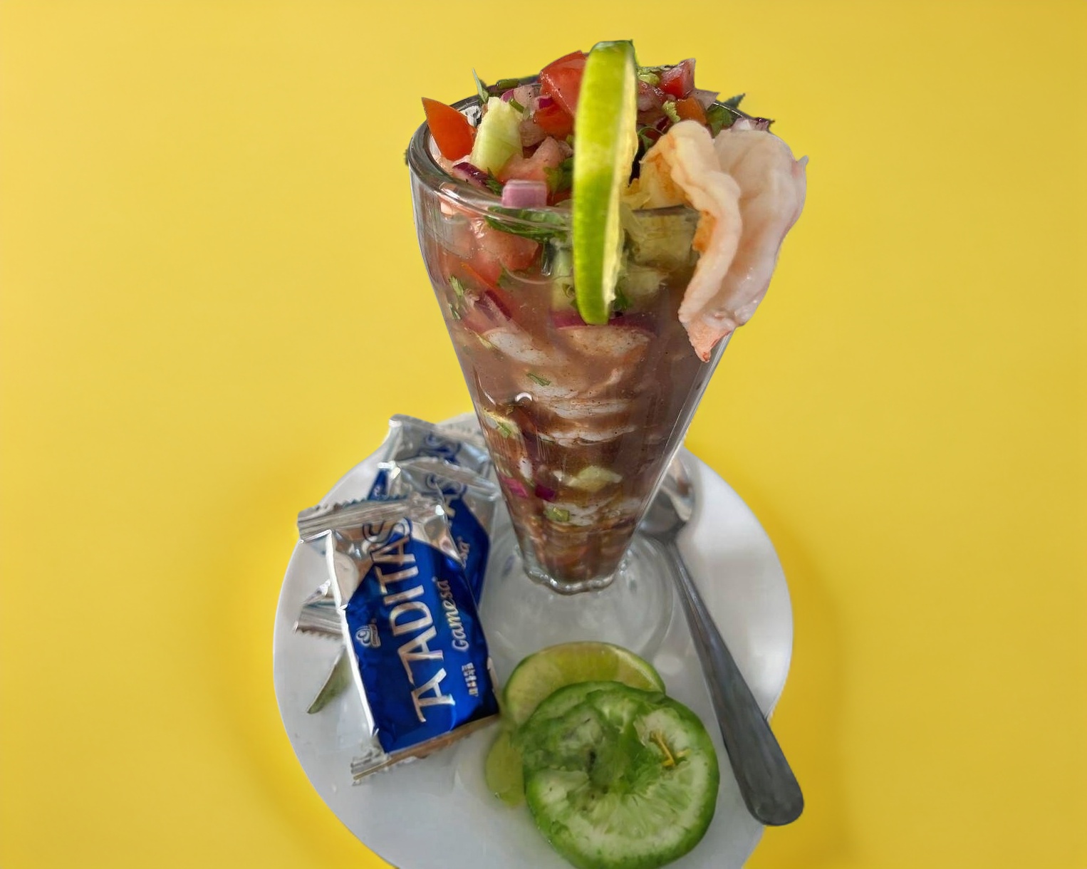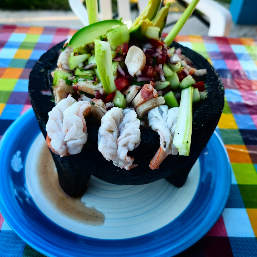 camaron, caracol y pulpo curtido con salsa inglesa y otras especias