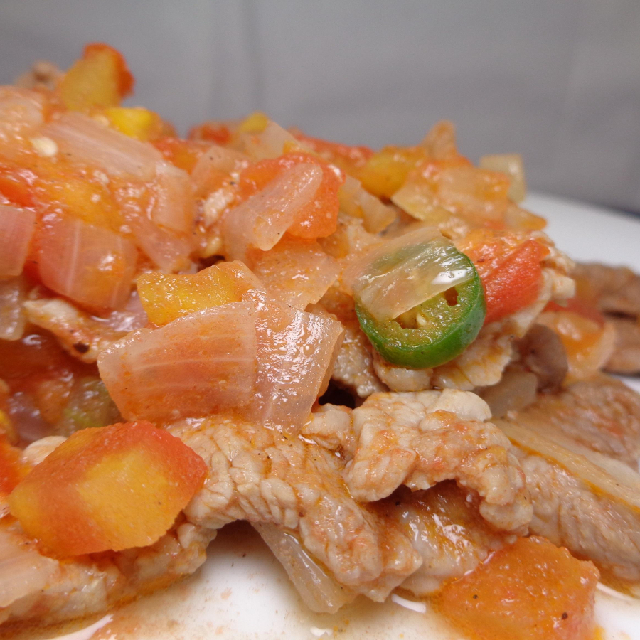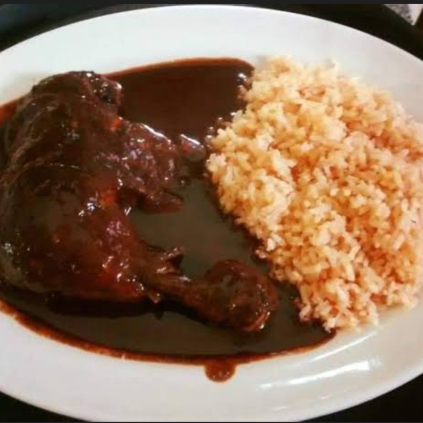 Tomate, cebolla, chile dulce, especias acompañada de arroz, frijol y tortillas