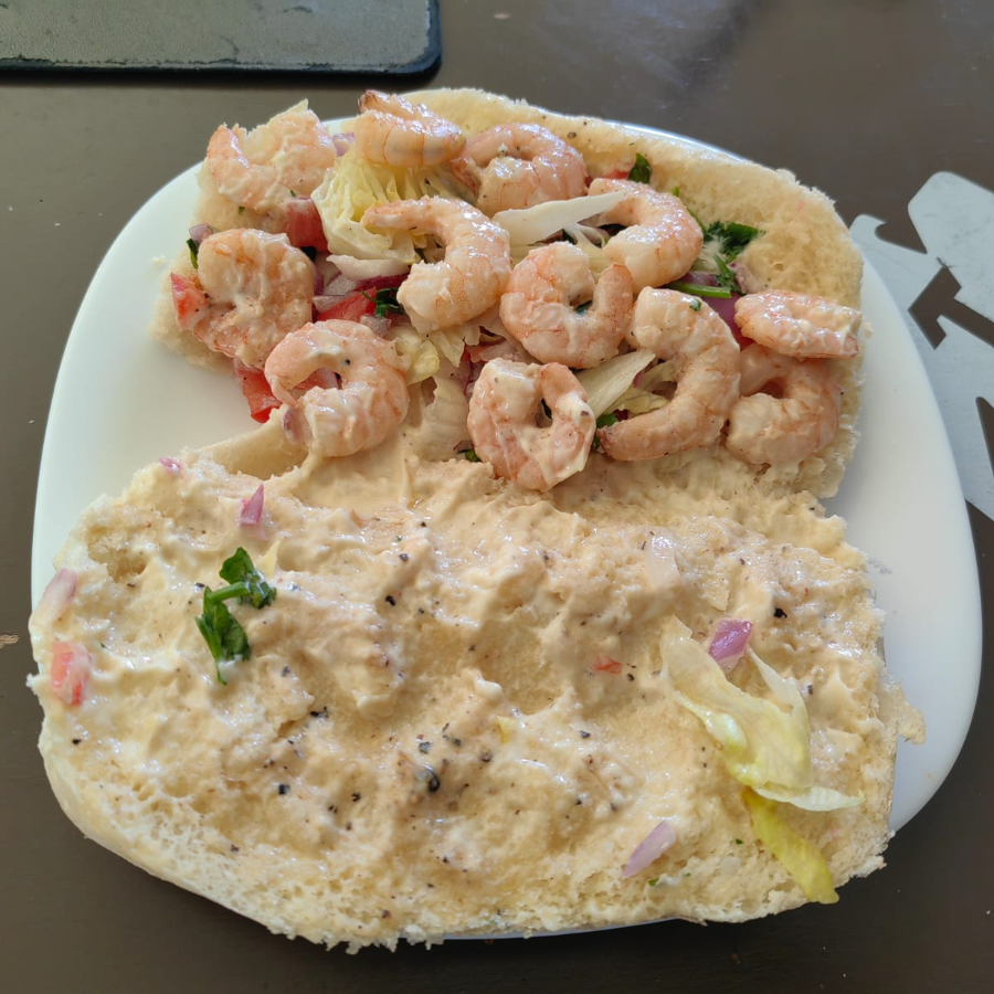 Pan, mayonesa,romanita,pico de gallo camarones