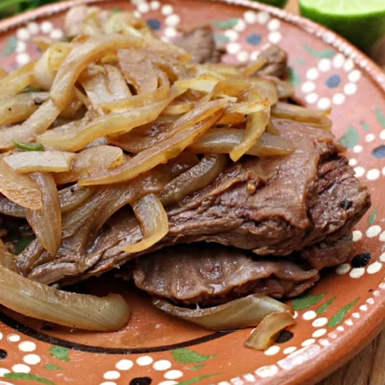 cebolla frita con carne de puerco, incluye arroz, frijol, Ensalada de verdura y tortillas.