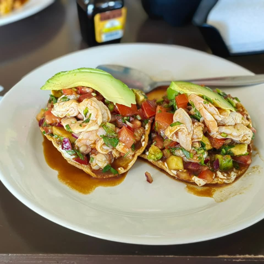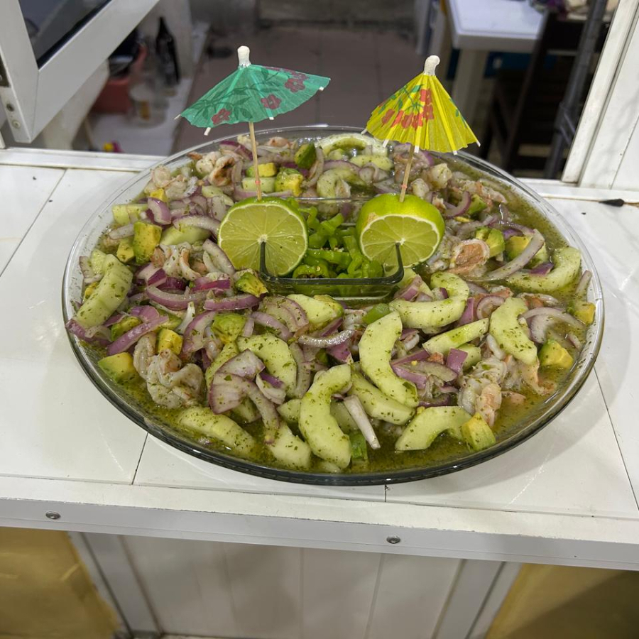 camaron curtido en limon con pimienta sal, limon, cebolla, tomate acompañado de ricas tostadas