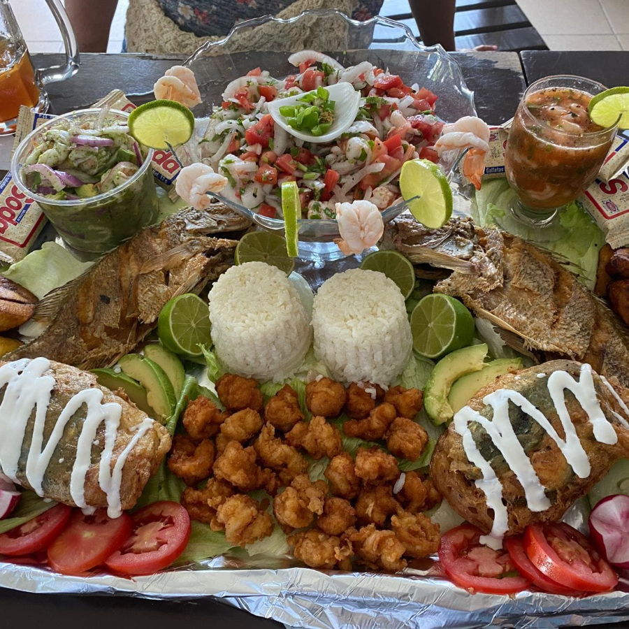 incluye dos pescados dos cokteles de camaron, ceviche de camaron, camarones empanizados arroz, tortillas