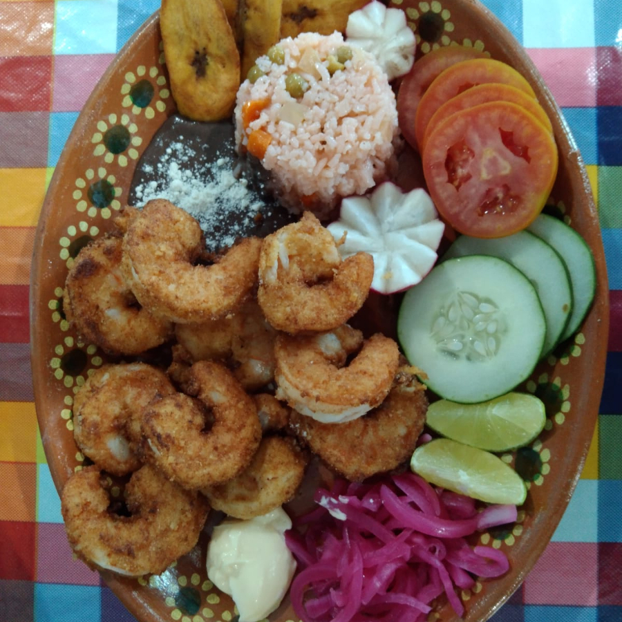 camarones empanizados con guarniciones arroz, frijol, verduras