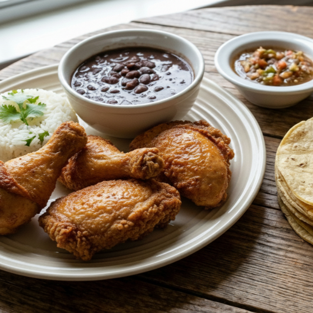 pollo frito con arroz, frijol, ensalada de verduras y tortillas.