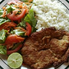 carne frita con pan molido y cebolla azada acompañado de arroz, frijol y ensalada de verduras