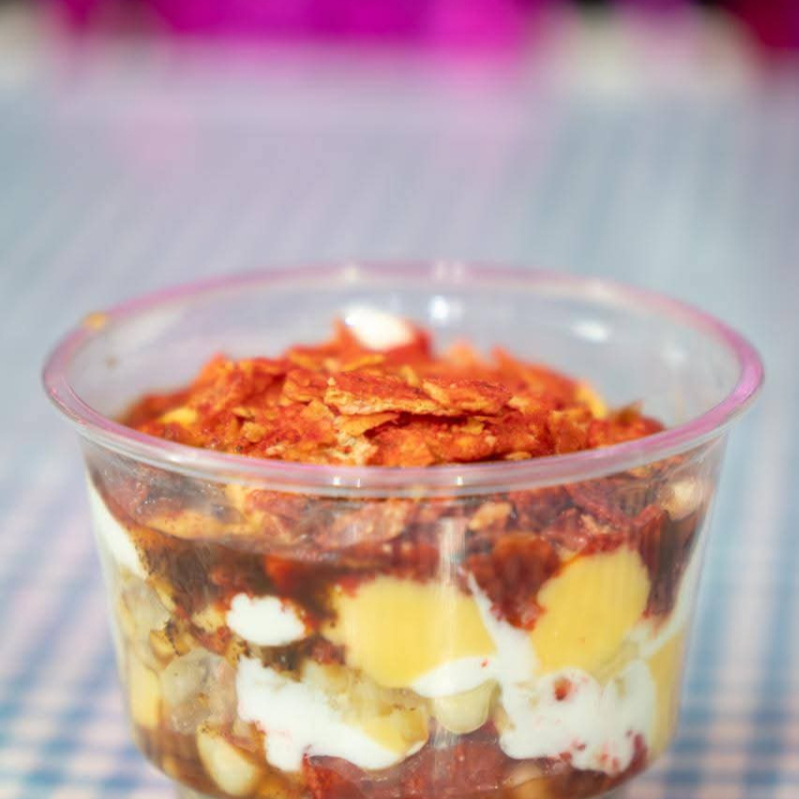 Cheetos flamin hot, elote, queso de nachos, queso sopero, media crema, chilito con limón en vaso.