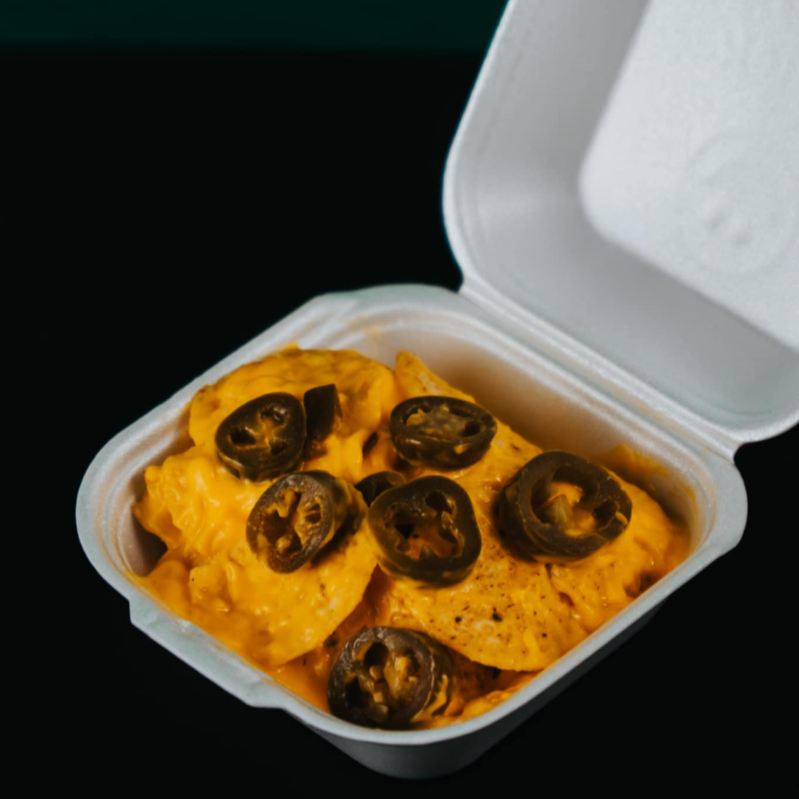 Preparados con queso para nachos, totopos de Tostitos amarillos y chiles jalapeños.