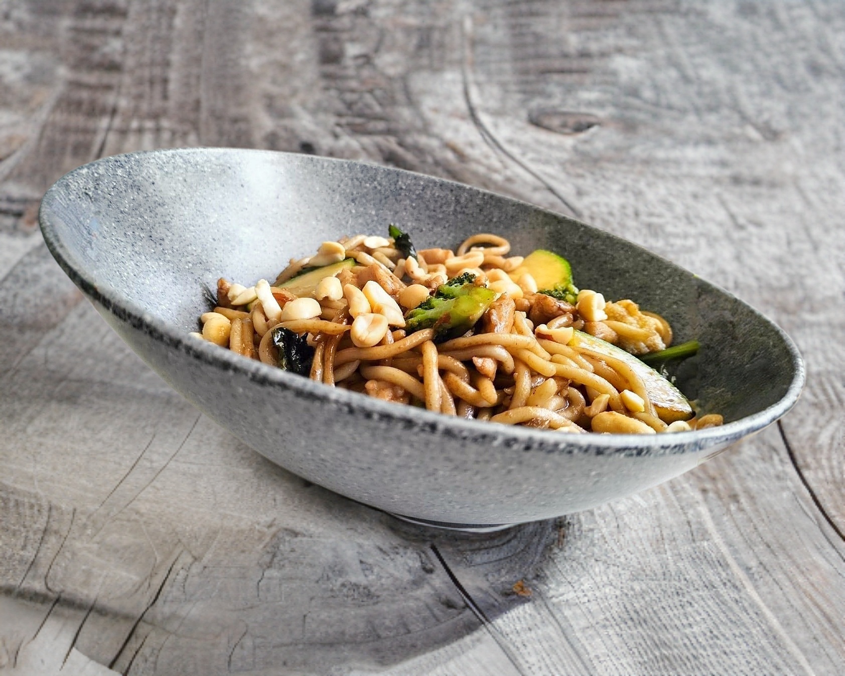 Wok de pechuga de pollo, elige tu base, vegetales, salsa y toppings para hacerlo a tu gusto.