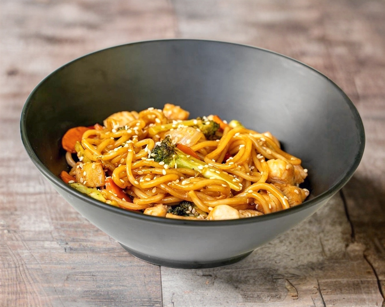 Wok de pollo, res y camarones, elige tu base, vegetales, salsa y topping, para hacerlo a tu gusto.