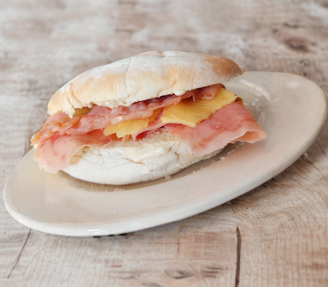 Bolillo con jamón, queso manchego y tocino