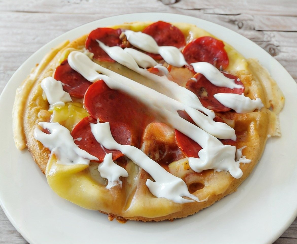 Pizza Waffle con salsa de tomate, queso manchego y pepperoni ó jamón