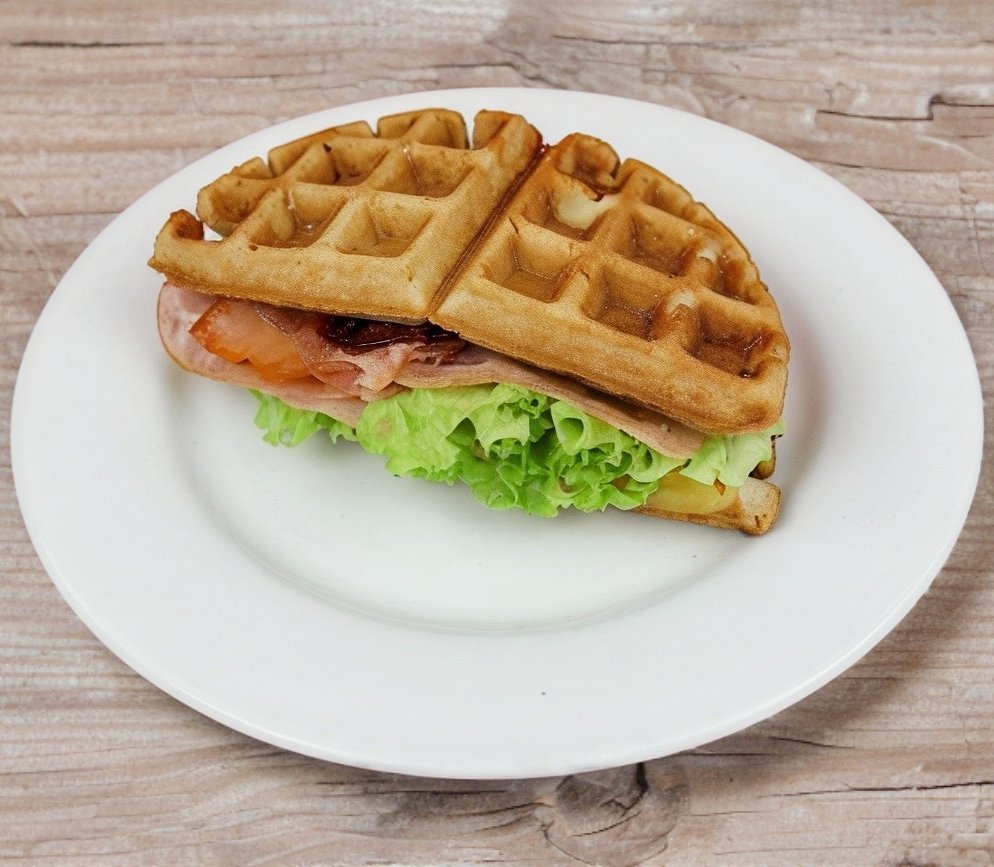 Delicioso Sandwich waffle con Jamón de Pavo, Queso Manchego y Tocino