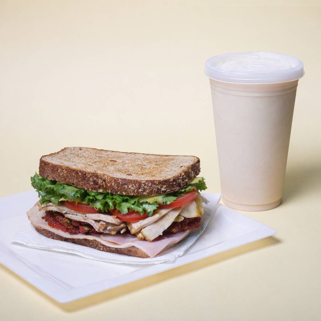 Sándwich de pan integral, con jamón y queso, aguacate, tomate, lechuga, mayonesa, jalapeño y un guiso a elegir.
