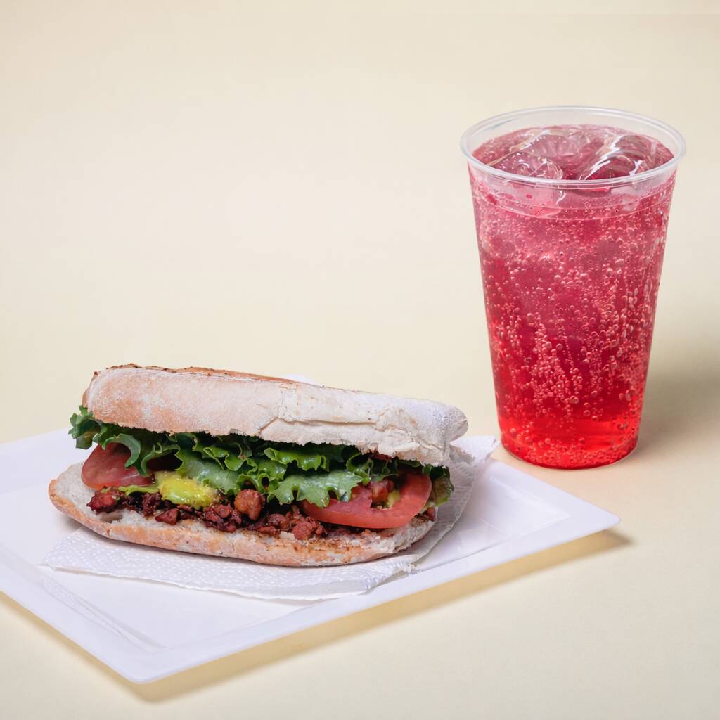 Sándwich de pan integral, con aguacate, tomate, lechuga, mayonesa, jalapeño y un guiso a elegir.