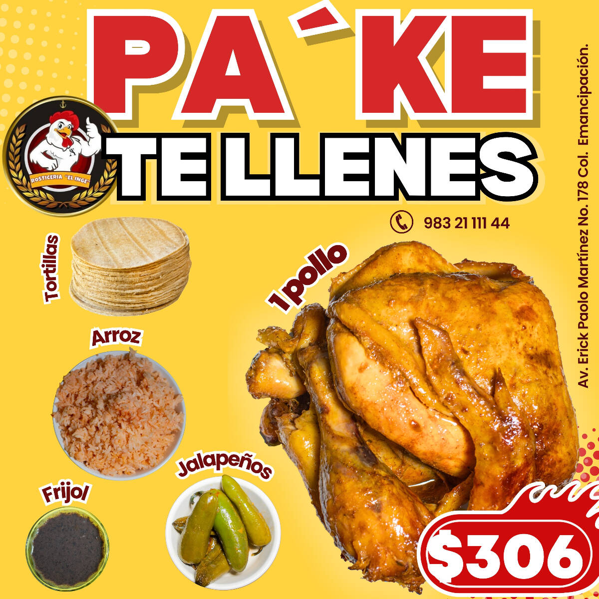 Pollo ristizado entero, medio kilo de papas Cambray, 250 de tortilla de maiz, 250 grs de arroz, 250 ml de Frijol colado, dos chiles jalapeños, 100 ml de Salsa.