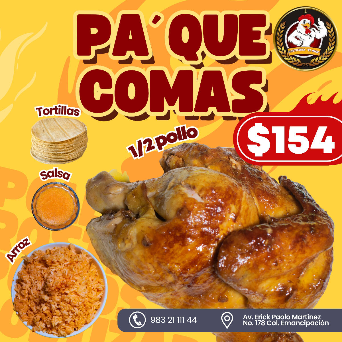 Medio pollo Rostizado, 125 gramos de Tortilla, 250 grs de Arroz, y 100 Ml de Salsa Roja.