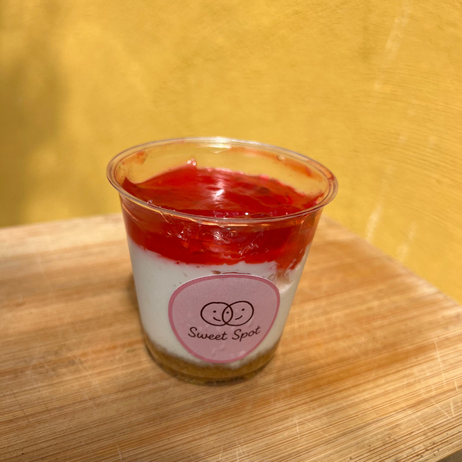 Postre frío con base de galleta de vainilla y mantequilla, crema tipo cheesecake y cubierta de coulis de fresa.