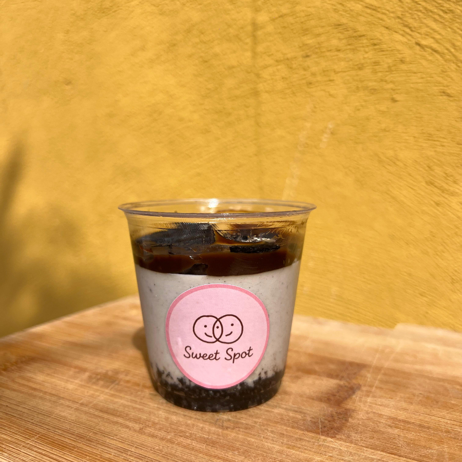 Postre frío con base de galleta oreo y mantequilla, crema con un toque de relleno oreo, cubierta de crema de chocolate y trozos de galleta oreo.