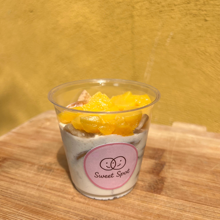 Postre frío con crema de limón, galletas maría troceadas y durazno picado.