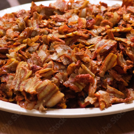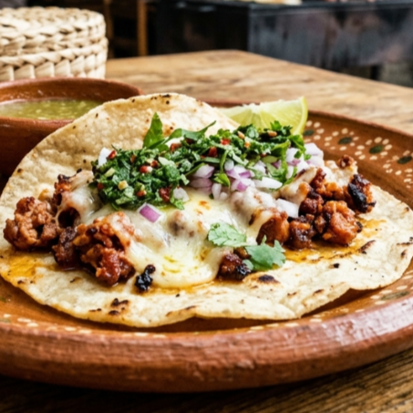 Totopos bañados con frijol, carne de pastor y queso derretido