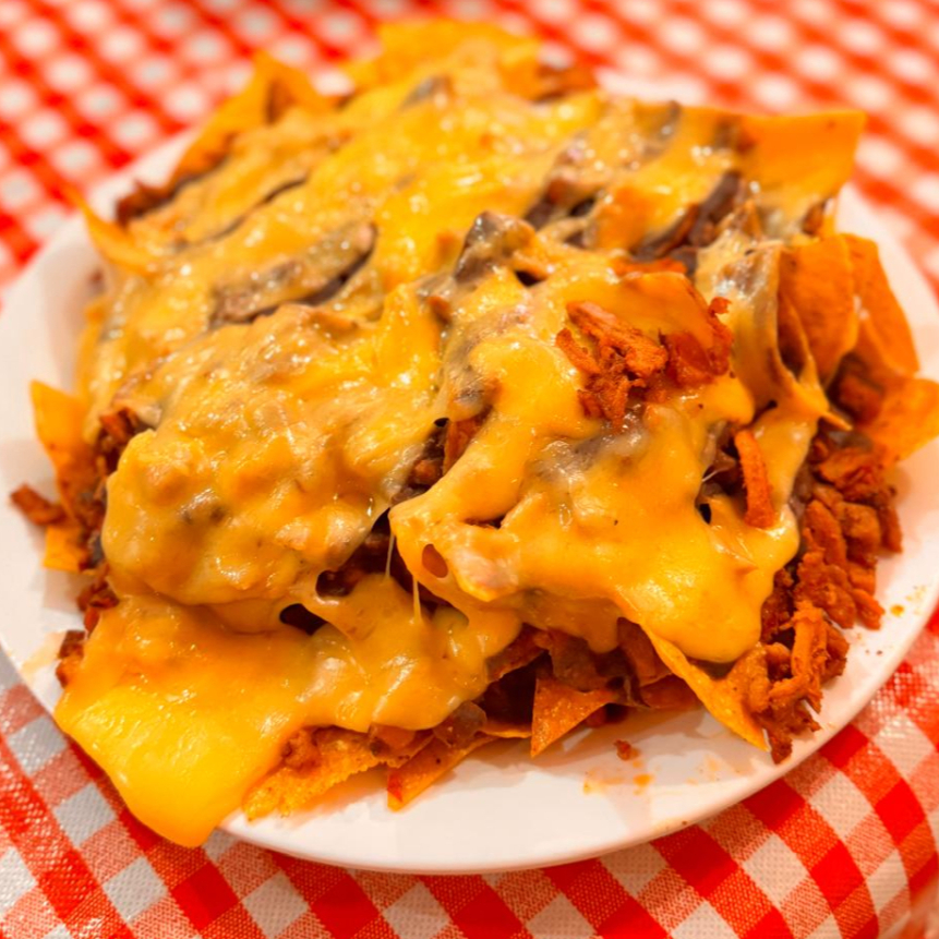 Totopos bañados con frijol, chorizo argentino y queso derretido