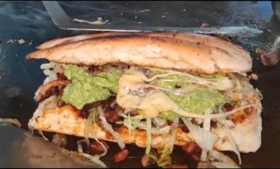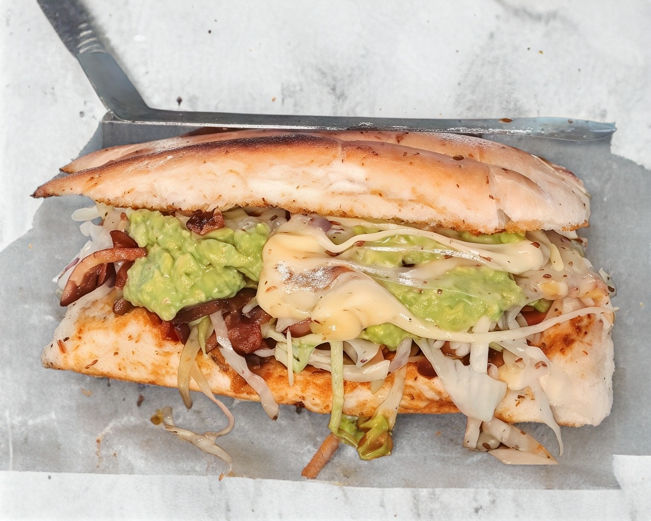 Carne terminator con queso gratinado y guacamole, sobre un pan grande.