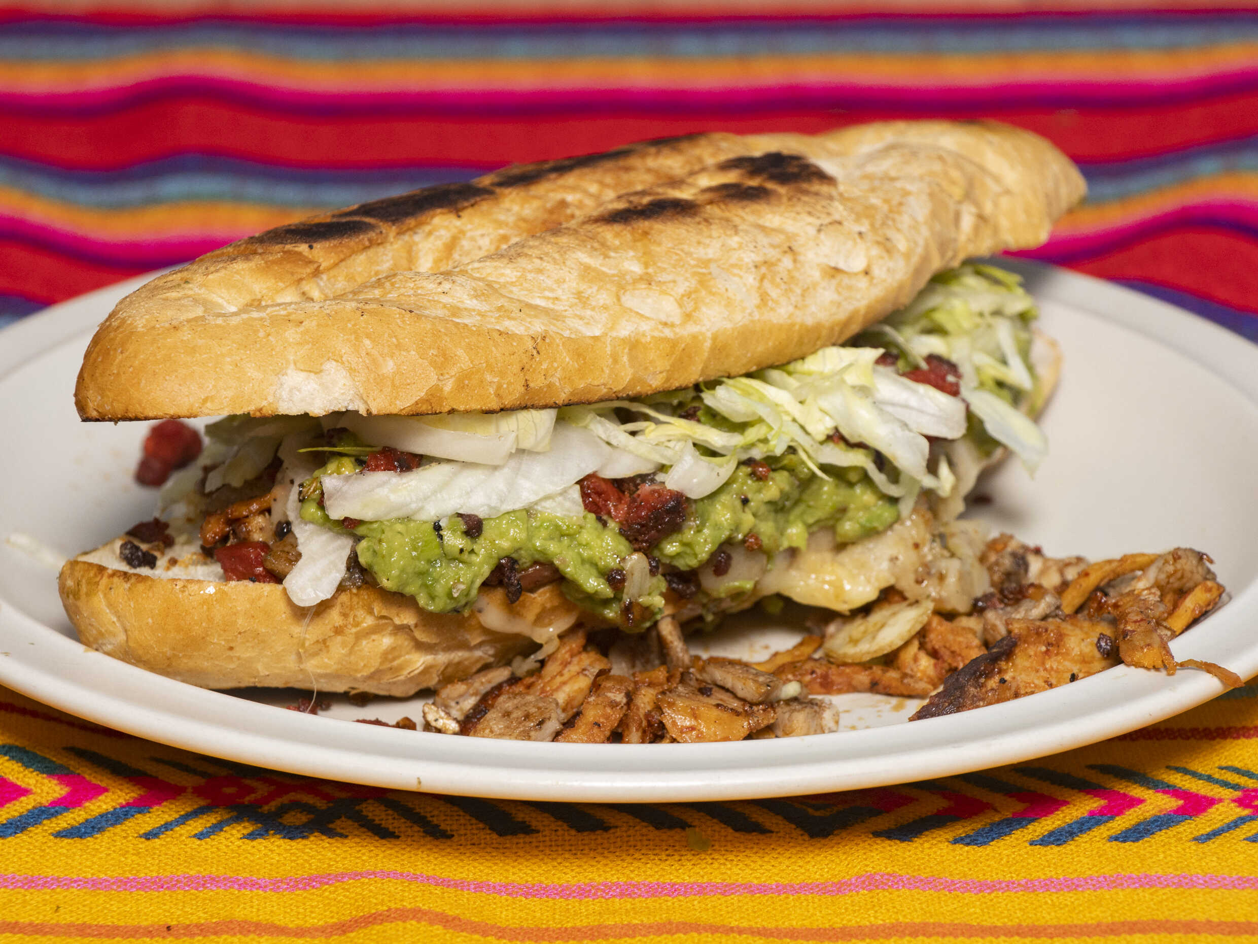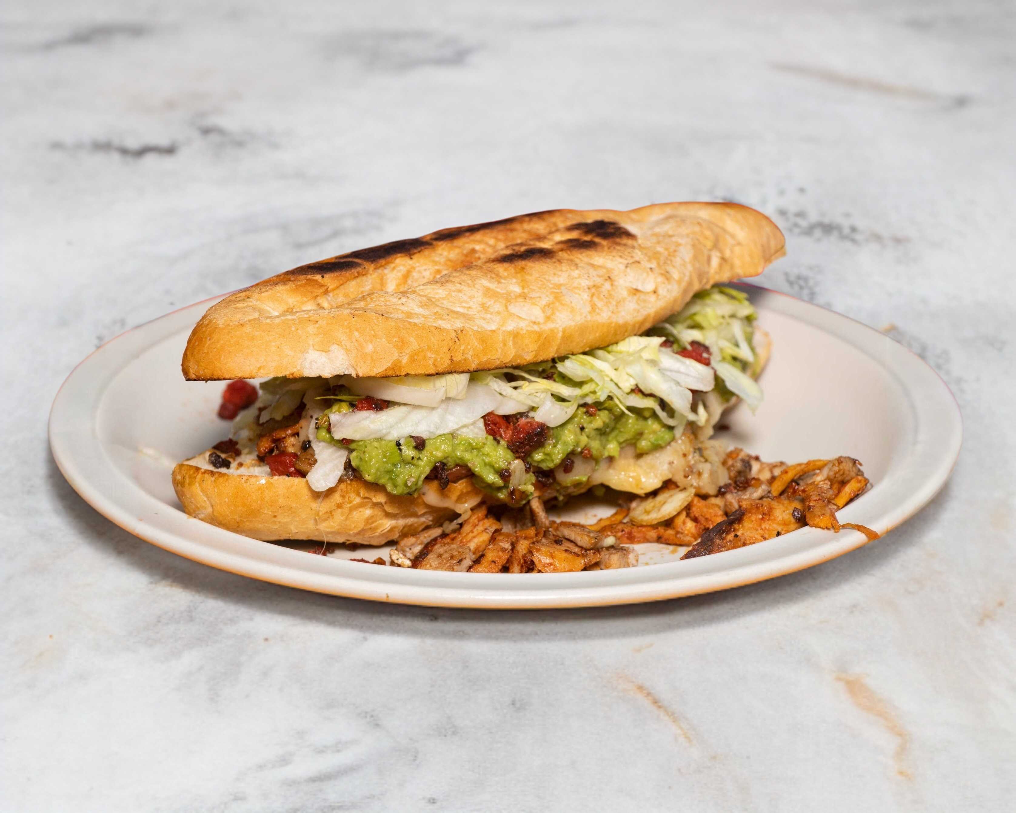 Pan grande, carne pastor, chuleta, chorizo, jamón, salchicha gratinada con queso manchego, romanita y guacamole.