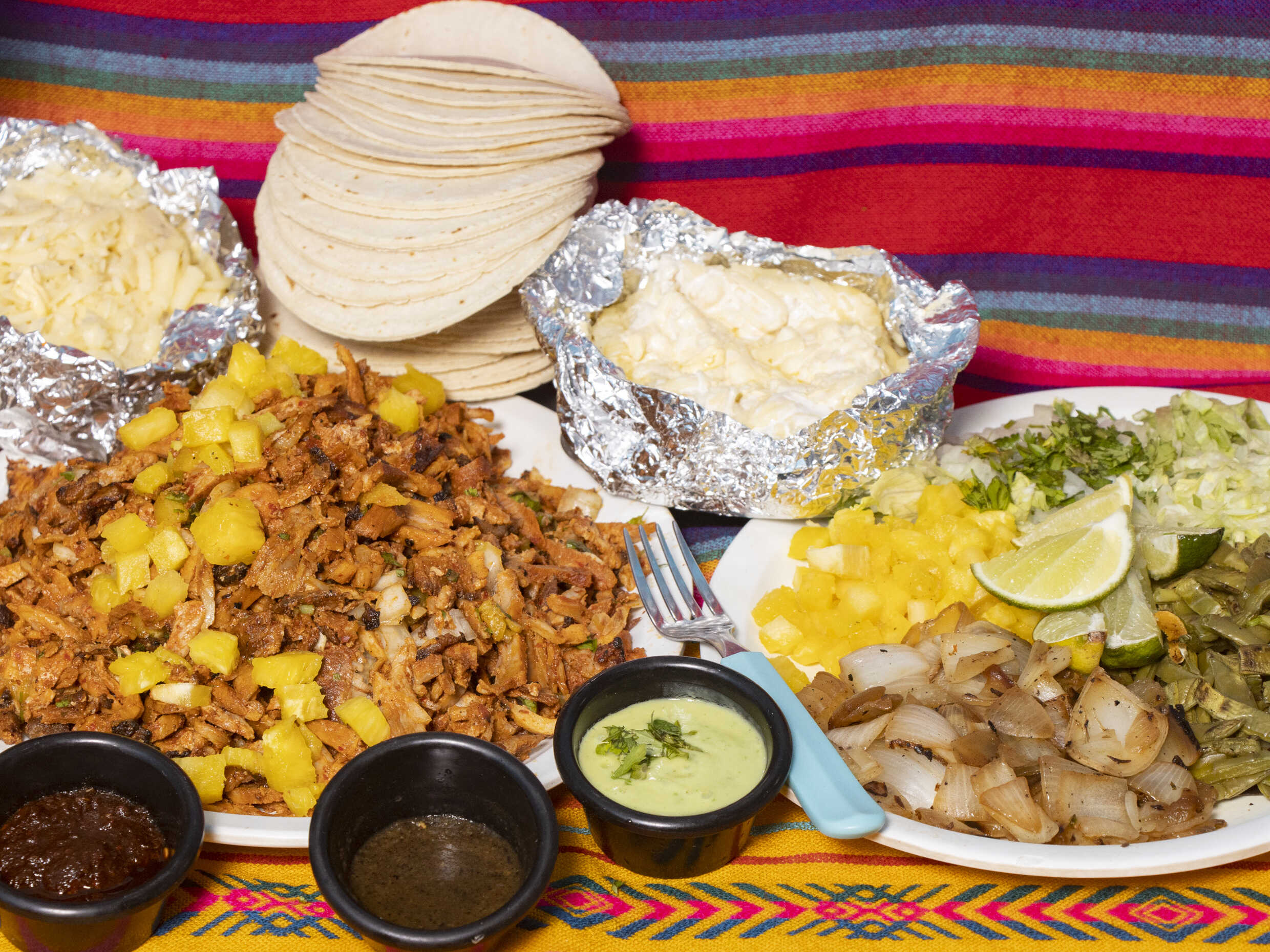 Carne, tortillas, papa aderezada, limones, cebolla asada, nopales, cebolla y cilantro.
