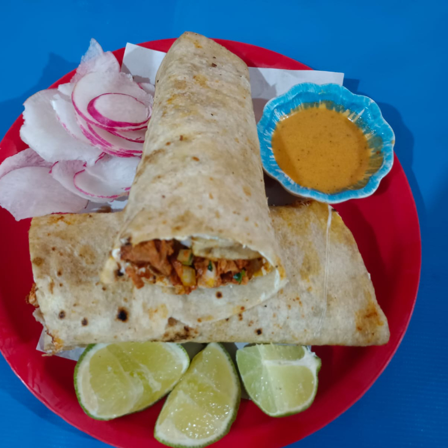 tortilla de maiz con frijol, queso de bola, romanita, cebolla, tomate, crema y pastor
