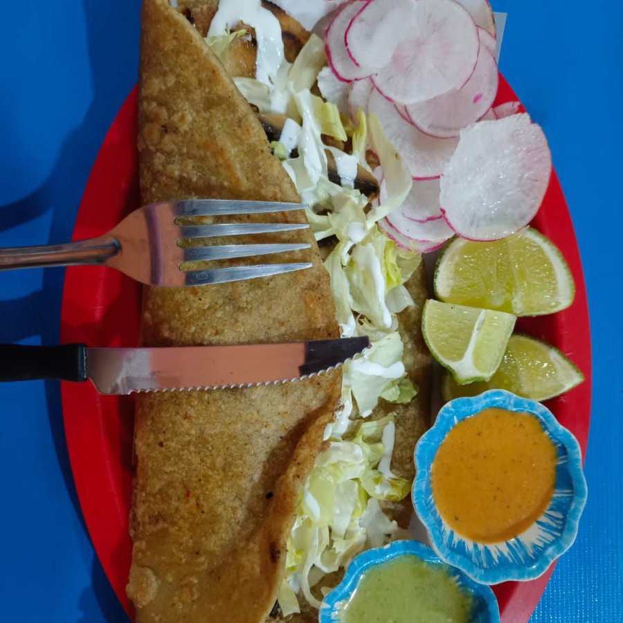 tortilla de maiz con frijol, queso, tomate, romanita, crema, cebolla, aguacate y empanizado de puerco