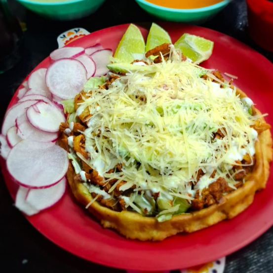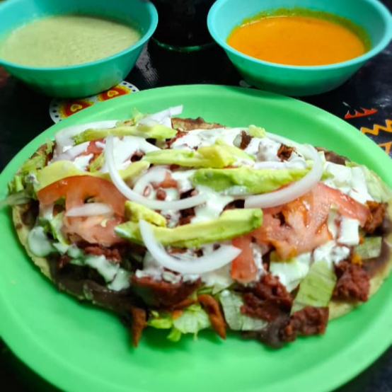 tortilla de maiz con frijol, queso, tomate, romanita, crema, cebolla, aguacate y chuleta