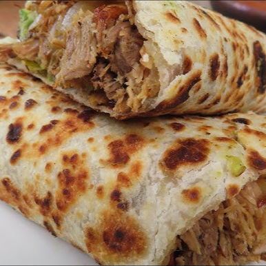 tortilla de harina casera con queso de hebra y asada de puerco