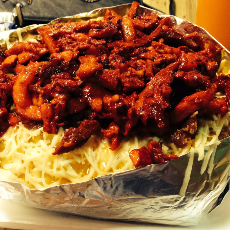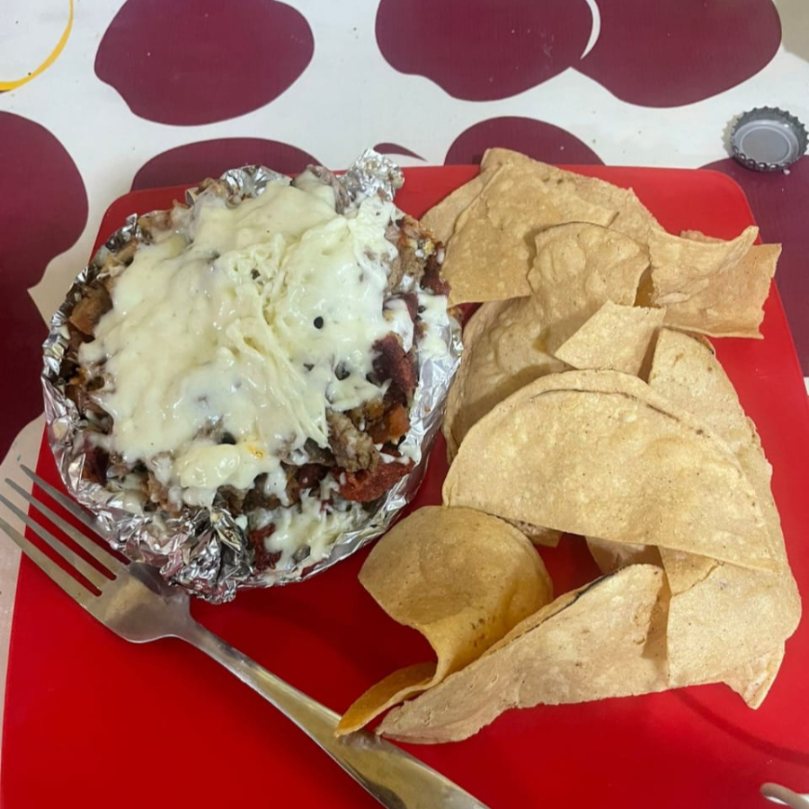 papa preparada, acompañada de queso de hebra y carne al pastor