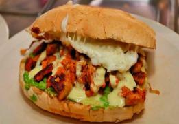 Telera con carne al pastor y queso de hebra fundido, cebolla y cilantro.
