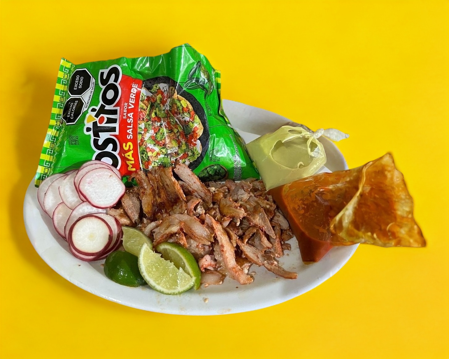 Tostitos más carne al pastor rábanos cilantro cebolla limón y piña salsa verde salsa roja