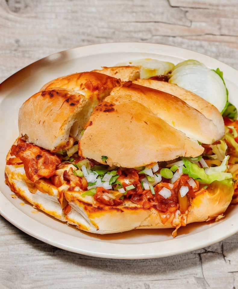 Telera con doble carne al pastor y doble queso fundido más cebolla y cilantro.