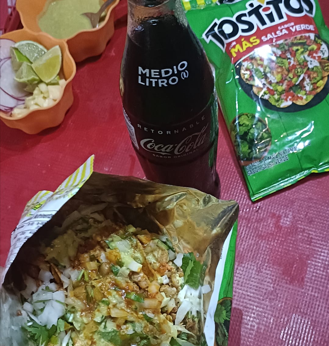 Bolsa de Tostitos con carne al pastor, cebolla y cilantro.