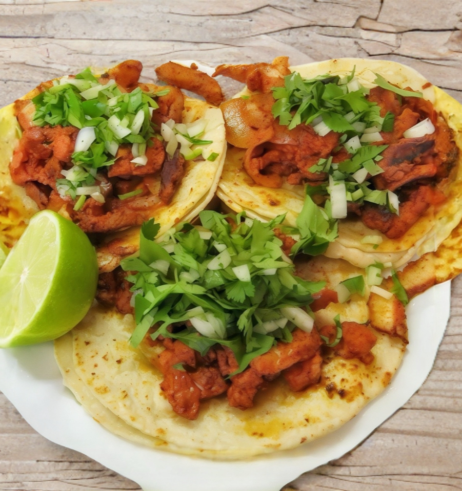 Tortilla de harina extra grande 30 cm, carne al pastor, queso fundido, cebolla y cilantro.